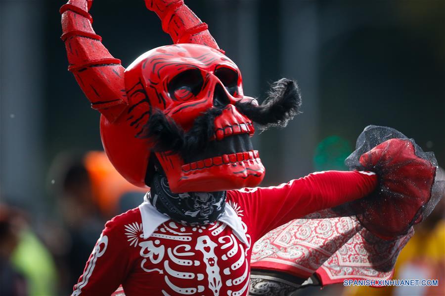 Una persona disfrazada participa en el Desfile de Día de Muertos 2018, en el marco de la celebración mexicana de Día de Muertos, en la Ciudad de México, capital de México, el 27 de octubre de 2018. De acuerdo con información de la prensa local, esta es la tercera edición del desfile, y comenzó en el monumento Estela de Luz y concluyó en el Zócalo de la capital de México. (Xinhua/Francisco Ca?edo)