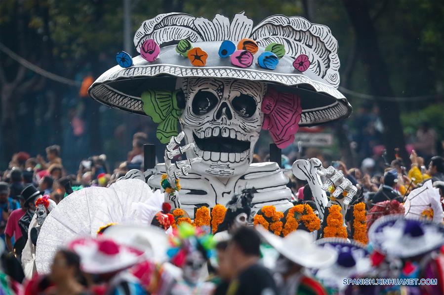Una "Catrina" gigante es exhibida durante el Desfile de Día de Muertos 2018, en el marco de la celebración mexicana de Día de Muertos, en la Ciudad de México, capital de México, el 27 de octubre de 2018. De acuerdo con información de la prensa local, esta es la tercera edición del desfile, y comenzó en el monumento Estela de Luz y concluyó en el Zócalo de la capital de México. (Xinhua/Francisco Ca?edo)