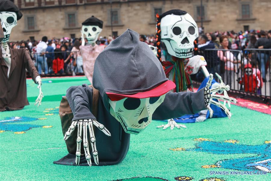 Vista de "Catrinas" siendo exhibidas como parte de la mega ofrenda con motivo de la conmemoración del tradicional Día de Muertos, en el Zócalo, en la Ciudad de México, capital de México, el 27 de octubre de 2018. De acuerdo con información de la prensa local, la mega ofrenda de este a?o permanecerá hasta el 4 de noviembre en el Zócalo capitalino, y está dedicada a los migrantes que han perdido la vida durante su camino hacia otros países. (Xinhua/Luis Castillo)