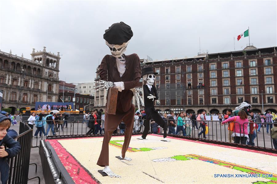 Vista de "Catrinas" siendo exhibidas como parte de la mega ofrenda con motivo de la conmemoración del tradicional Día de Muertos, en el Zócalo, en la Ciudad de México, capital de México, el 27 de octubre de 2018. De acuerdo con información de la prensa local, la mega ofrenda de este a?o permanecerá hasta el 4 de noviembre en el Zócalo capitalino, y está dedicada a los migrantes que han perdido la vida durante su camino hacia otros países. (Xinhua/Luis Castillo)