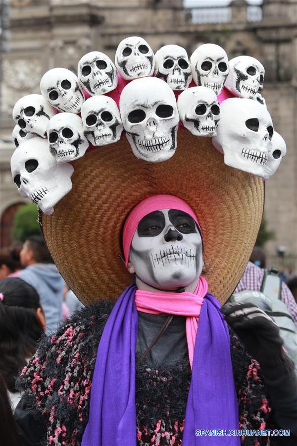 Una persona disfrazada de "Catrina" visita la mega ofrenda con motivo de la conmemoración del tradicional Día de Muertos, en el Zócalo, en la Ciudad de México, capital de México, el 27 de octubre de 2018. De acuerdo con información de la prensa local, la mega ofrenda de este a?o permanecerá hasta el 4 de noviembre en el Zócalo capitalino, y está dedicada a los migrantes que han perdido la vida durante su camino hacia otros países. (Xinhua/Luis Castillo)