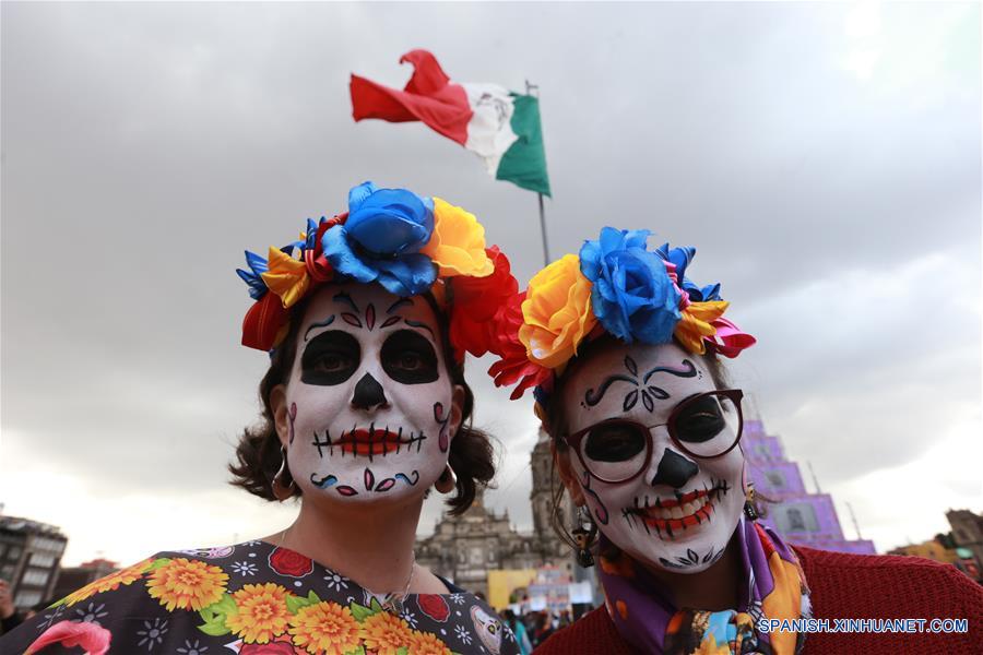 CIUDAD DE MEXICO, octubre 27, 2018 (Xinhua) -- Personas disfrazadas de "Catrinas" posan mientras visitan la mega ofrenda con motivo de la conmemoración del tradicional Día de Muertos, en el Zócalo, en la Ciudad de México, capital de México, el 27 de octubre de 2018. De acuerdo con información de la prensa local, la mega ofrenda de este a?o permanecerá hasta el 4 de noviembre en el Zócalo capitalino, y está dedicada a los migrantes que han perdido la vida durante su camino hacia otros países. (Xinhua/Luis Castillo)