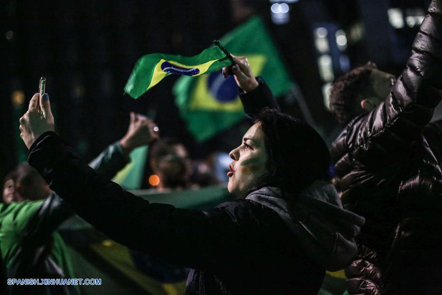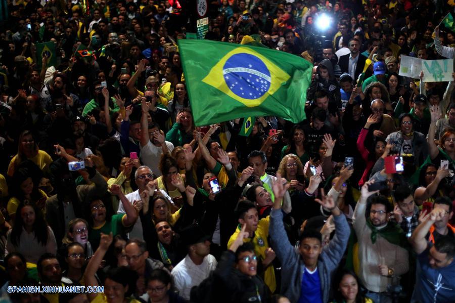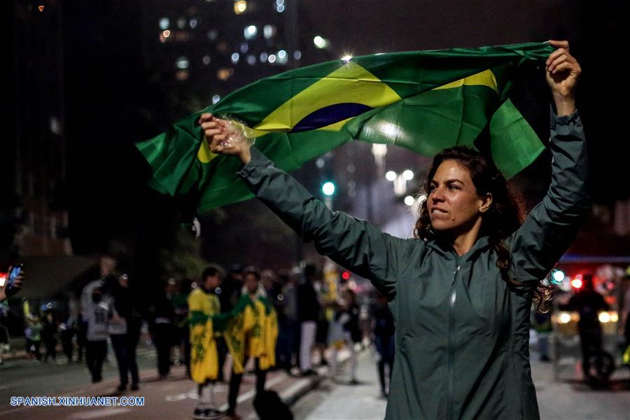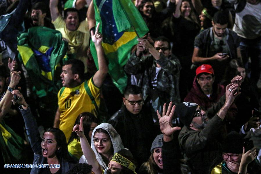 SAO PAULO, octubre 28, 2018 (Xinhua) -- Simpatizantes del presidente electo de Brasil, Jair Bolsonaro, reaccionan al conocer los resultados de las elecciones generales en Sao Paulo, Brasil, el 28 de octubre de 2018. El presidente electo de Brasil, Jair Bolsonaro, de 63 a?os, ganó el domingo las elecciones presidenciales en Brasil con un 55,34 por ciento de los votos, contra el 44,66 por ciento de su rival, Fernando Haddad, del Partido de los Trabajadores (PT), con el 98 por ciento del escrutinio finalizado (Xinhua/Rahel Patrasso)