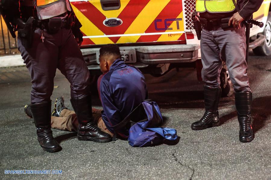SAO PAULO, octubre 28, 2018 (Xinhua) -- Un hombre es detenido durante las celebraciones de los simpatizantes del candidato presidencial Jair Bolsonaro, por el Partido Social Liberal (PSL), después de conocer los resultados de las elecciones generales en Sao Paulo, Brasil, el 28 de octubre de 2018. El candidato del Partido Social Liberal (PSL), Jair Bolsonaro, es el ganador virtual de las elecciones a la Presidencia de Brasil, con el 55,54 por ciento de los votos, contra el 44,46 por ciento de su rival, Fernando Haddad, del Partido de los Trabajadores (PT), al escrutarse el 94,44 por ciento del escrutinio realizado, según datos del Tribunal Superior Electoral (TSE). (Xinhua/Rahel Patrasso)