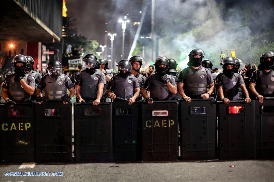 SAO PAULO, octubre 28, 2018 (Xinhua) -- Policías montan guardia para evitar enfrentamientos de simpatizantes después de conocer los resultados de las elecciones generales en Sao Paulo, Brasil, el 28 de octubre de 2018. El presidente electo de Brasil, Jair Bolsonaro, de 63 a?os, ganó el domingo las elecciones presidenciales en Brasil con un 55,34 por ciento de los votos, contra el 44,66 por ciento de su rival, Fernando Haddad, del Partido de los Trabajadores (PT), con el 98 por ciento del escrutinio finalizado (Xinhua/Rahel Patrasso)