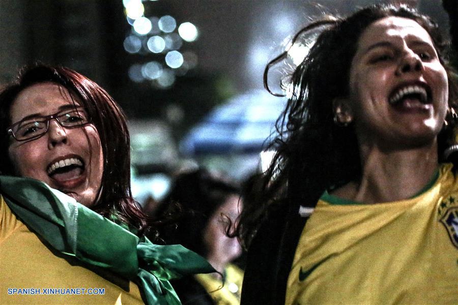 SAO PAULO, octubre 28, 2018 (Xinhua) -- Simpatizantes del presidente electo de Brasil, Jair Bolsonaro, reaccionan al conocer los resultados de las elecciones generales en Sao Paulo, Brasil, el 28 de octubre de 2018. La presidente del Tribunal Superior Electoral (TSE) de Brasil, Rosa Weber, anunció en la noche del domingo formalmente la victoria de Jair Bolsonaro, del Partido Social Liberal (PSL), en la segunda vuelta electoral, consagrado presidente electo del país sudamericano. (Xinhua/Rahel Patrasso)
