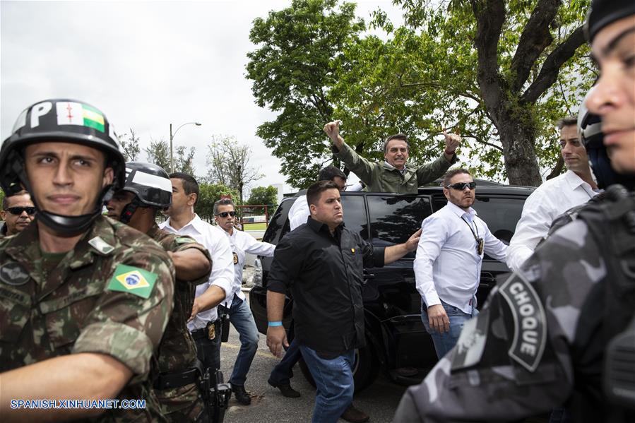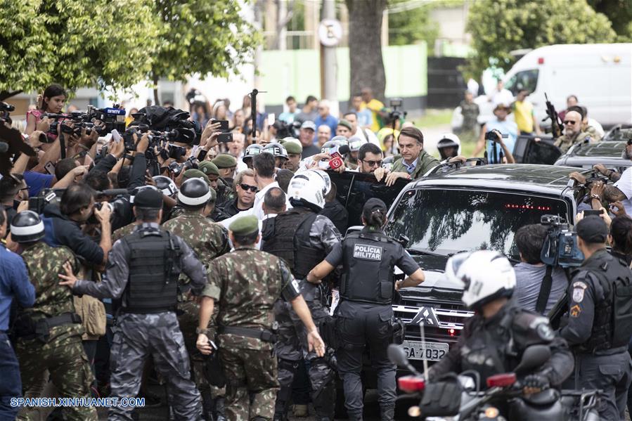 RIO DE JANEIRO, octubre 28, 2018 (Xinhua) -- El candidato del Partido Social Liberal (PSL) a la Presidencia de Brasil, Jair Bolsonaro (c), se retira luego de emitir su voto para la segunda vuelta de las elecciones generales, en Río de Janeiro, Brasil, el 28 de octubre de 2018. Los brasile?os acuden el domingo a votar en la segunda vuelta de las elecciones generales de Brasil, en medio de una fuerte división que refleja la profunda crisis económica y política de los últimos a?os, con un incremento de posiciones extremistas y episodios de violencia política. (Xinhua/Li Ming)