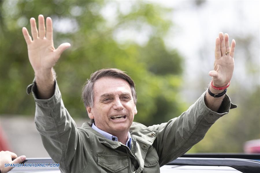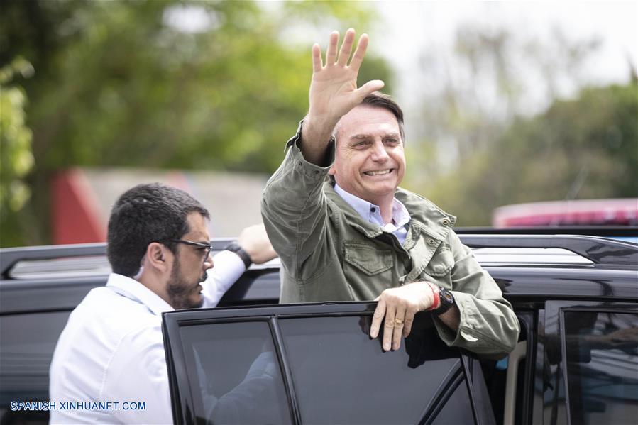 RIO DE JANEIRO, octubre 28, 2018 (Xinhua) -- El candidato del Partido Social Liberal (PSL) a la Presidencia de Brasil, Jair Bolsonaro (4-d), saluda luego de emitir su voto para la segunda vuelta de las elecciones generales, en Río de Janeiro, Brasil, el 28 de octubre de 2018. Los brasile?os acuden el domingo a votar en la segunda vuelta de las elecciones generales de Brasil, en medio de una fuerte división que refleja la profunda crisis económica y política de los últimos a?os, con un incremento de posiciones extremistas y episodios de violencia política. (Xinhua/Li Ming)