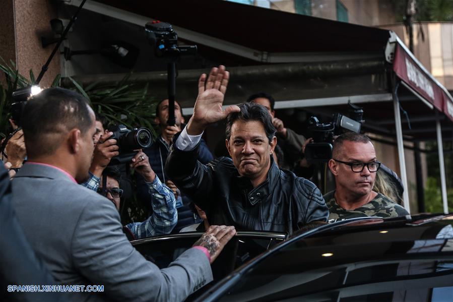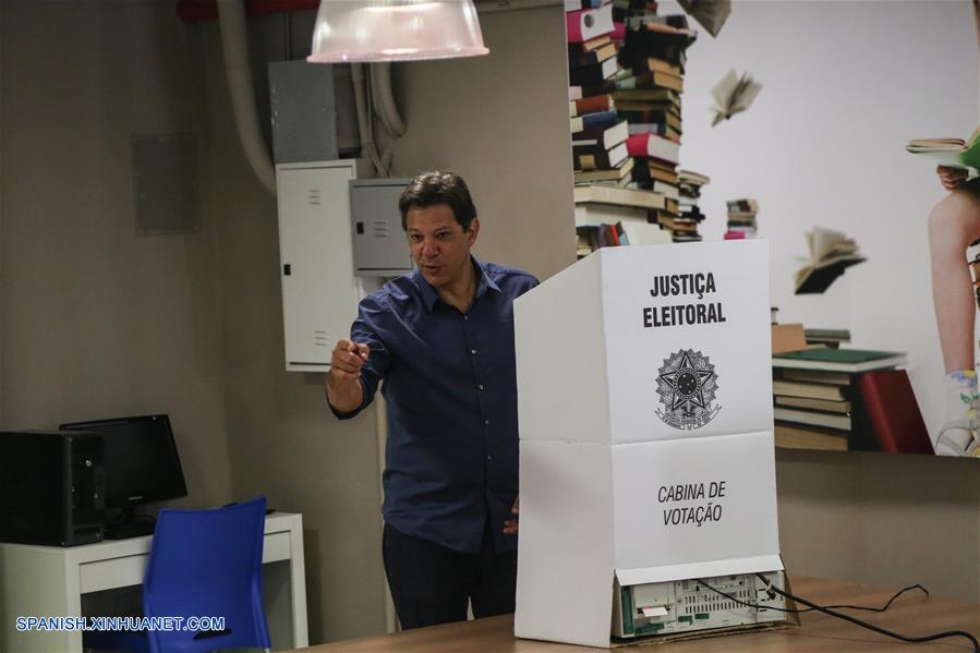 SAO PAULO, octubre 28, 2018 (Xinhua) -- El candidato presidencial por el Partido de los Trabajadores (PT), Fernando Haddad, acude a emitir su voto para la segunda vuelta de las elecciones generales en una casilla electoral, en Sao Paulo, Brasil, el 28 de octubre de 2018. Los colegios electorales abrieron las puertas el domingo en Brasil a las 8:00, hora de Brasilia (11:00 GMT), para la segunda vuelta de las elecciones generales, en las que se elegirán al presidente y vicepresidente del país para los próximos cuatro a?os. (Xinhua/Rahel Patrasso)