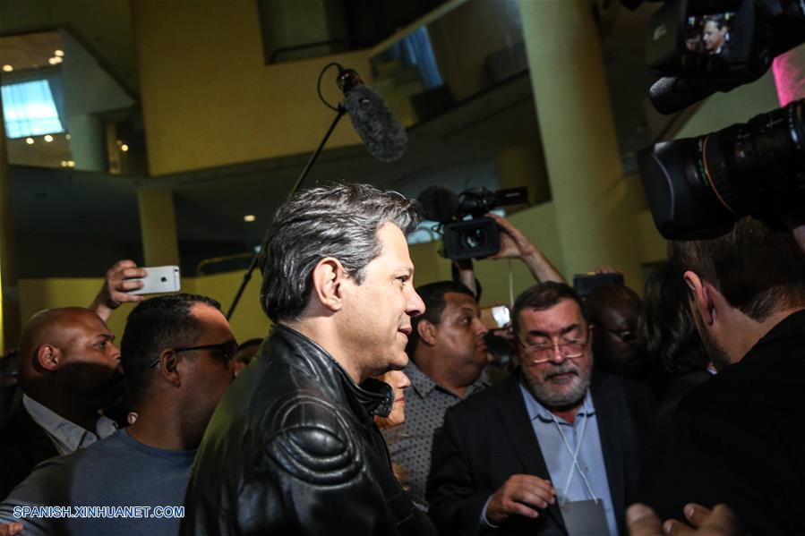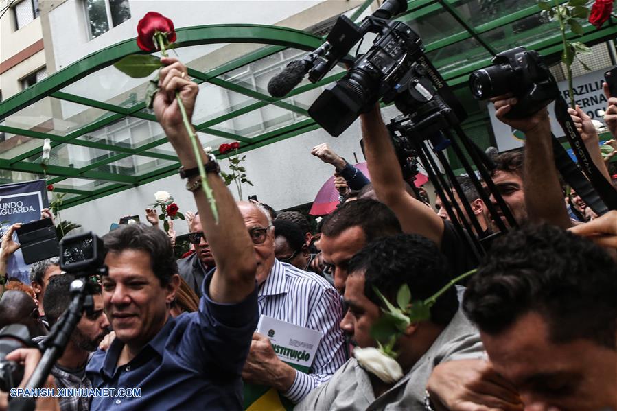 SAO PAULO, octubre 28, 2018 (Xinhua) -- El candidato presidencial por el Partido de los Trabajadores (PT), Fernando Haddad (c-frente), conversa con representantes de los medios de comunicación después de emitir su voto para la segunda vuelta de las elecciones generales en Sao Paulo, Brasil, el 28 de octubre de 2018. Los colegios electorales abrieron las puertas el domingo en Brasil a las 8:00, hora de Brasilia (11:00 GMT), para la segunda vuelta de las elecciones generales, en las que se elegirán al presidente y vicepresidente del país para los próximos cuatro a?os. (Xinhua/Rahel Patrasso)