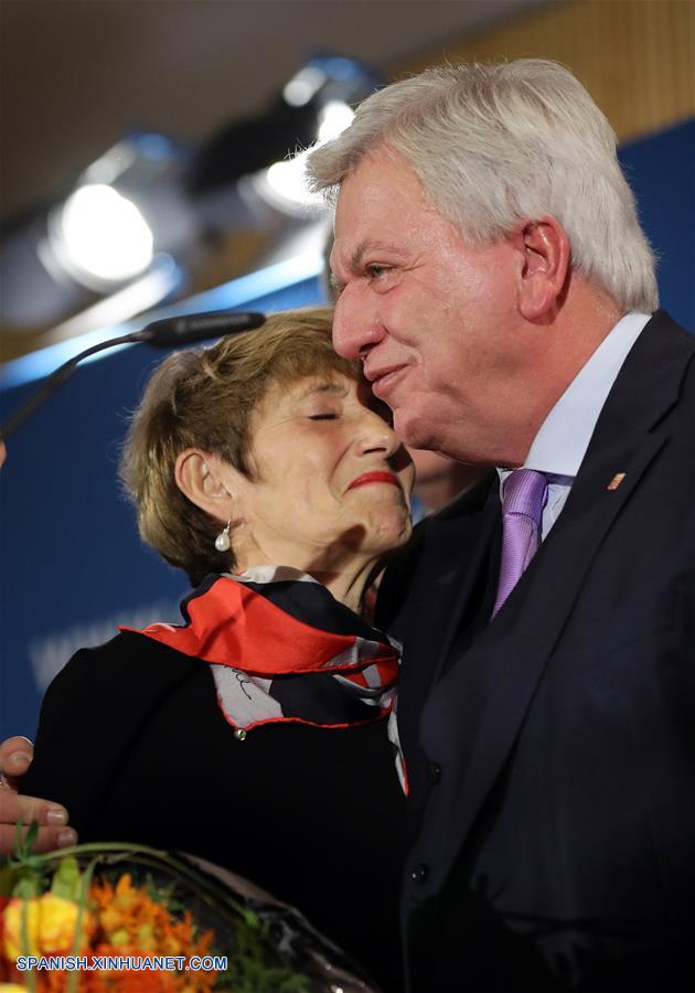 WIESBADEN, octubre 28, 2018 (Xinhua) -- El principal candidato de la Unión Cristianodemócrata (UCD) y primer ministro del Estado de Hesse, Volker Bouffier (d) y su esposa Ursula Bouffier (i), reaccionan después de la publicación de los resultados iniciales de la elección estatal de Hesse en Wiesbaden, Alemania, el 28 de octubre de 2018. La Unión Cristianodemócrata, liderada por la canciller alemana, Angela Merkel, sufrió una gran derrota en la elección estatal del domingo en Hesse, de acuerdo con el pronóstico inicial de la emisora pública ARD. (Xinhua/Luo Huanhuan)