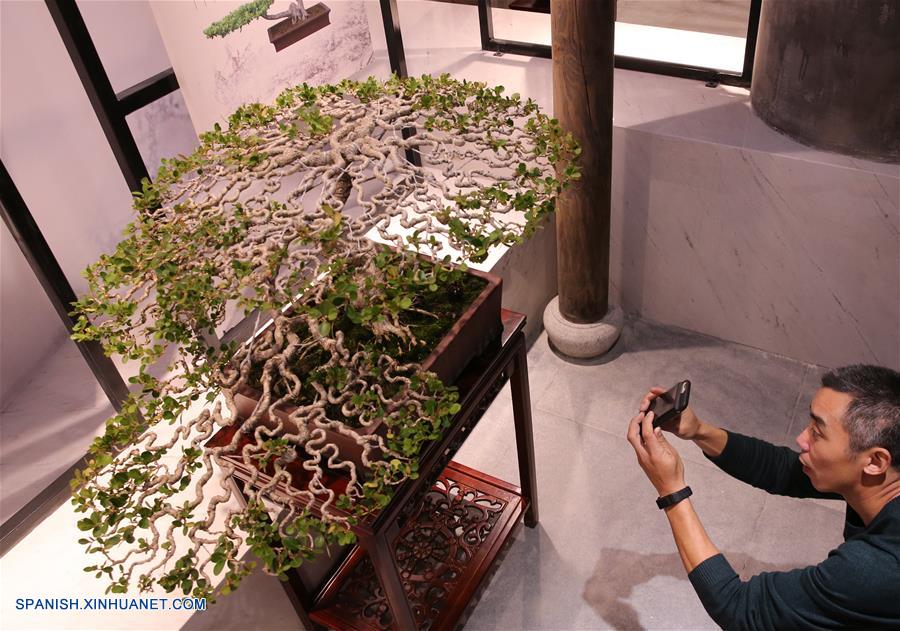 JIANGSU, octubre 28, 2018 (Xinhua) -- Un visitante toma una fotografía a un árbol bonsai en un museo de árboles bonsai en Rugao, provincia de Jiangsu, en el este de China, el 28 de octubre de 2018. (Xinhua/Xu Congjun)