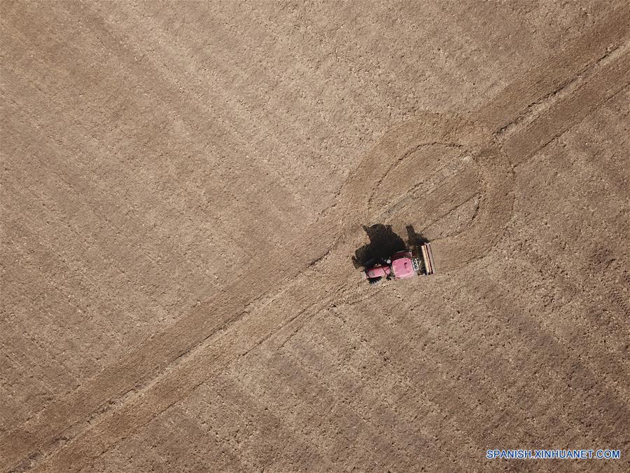 JIANGSU, octubre 29, 2018 (Xinhua) -- Vista aérea de una segadora plantando semillas en un campo de trigo en el municipio de Sanhe, del distrito de Hongze, en Huai'an, en la provincia de Jiangsu, en el este de China, el 29 de octubre de 2018. (Xinhua/Wan Zhen)