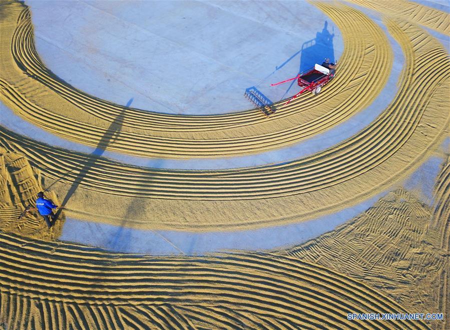JIANGSU, octubre 29, 2018 (Xinhua) -- Vista aérea de un granjero arando arroz para secarlo al aire en la villa Qufang, del distrito de Ganyu, en la ciudad de Lianyungang, en la provincia de Jiangsu, en el este de China, el 29 de octubre de 2018. (Xinhua/Geng Yuhe)