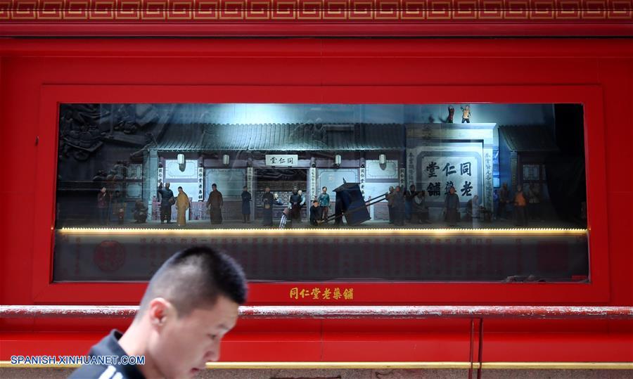 BEIJING, octubre 29, 2018 (Xinhua) -- Imagen del 25 de octubre de 2018 de un hombre caminando frente un corredor donde se exhibe la cultura corporativa de Tongrentang, una compa?ía farmacéutica con una historia de más de 300 a?os, en Beijing, capital de China. Fundada en 1669, Tongrentang es ahora un productor y distribuidor líder de medicina tradicional china en China, y ha obtenido una reputación mundial. Ha registrado su marca en más de 100 países y regiones. (Xinhua/Zhang Chenlin)