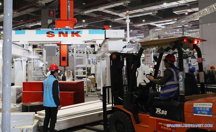 SHANGHAI, octubre 30, 2018 (Xinhua) -- Trabajadores transportan materiales en una sala de exposición en el Centro Nacional de Exposiciones y Convenciones de Shanghai, en Shanghai, en el este de China, el 30 de octubre de 2018. El trabajo final está en marcha para preparar las ocho salas de exposición para la primera Exposición Internacional de Importaciones de China (CIIE, por sus siglas en inglés), programada para llevarse a cabo del 5 al 10 de noviembre. (Xinhua/Fang Zhe)