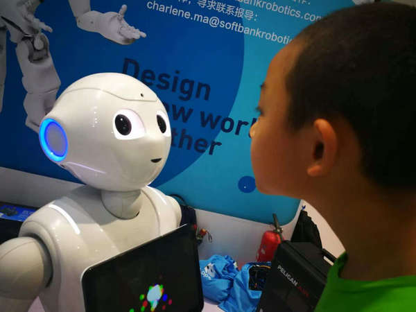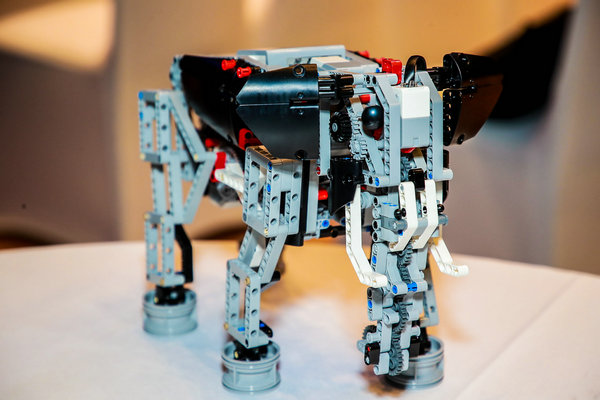 En el evento de Beijing se muestra un elefante y un mono robótico que se mueven mediante órdenes de codificación. [Foto: Xu Fan/ China Daily]