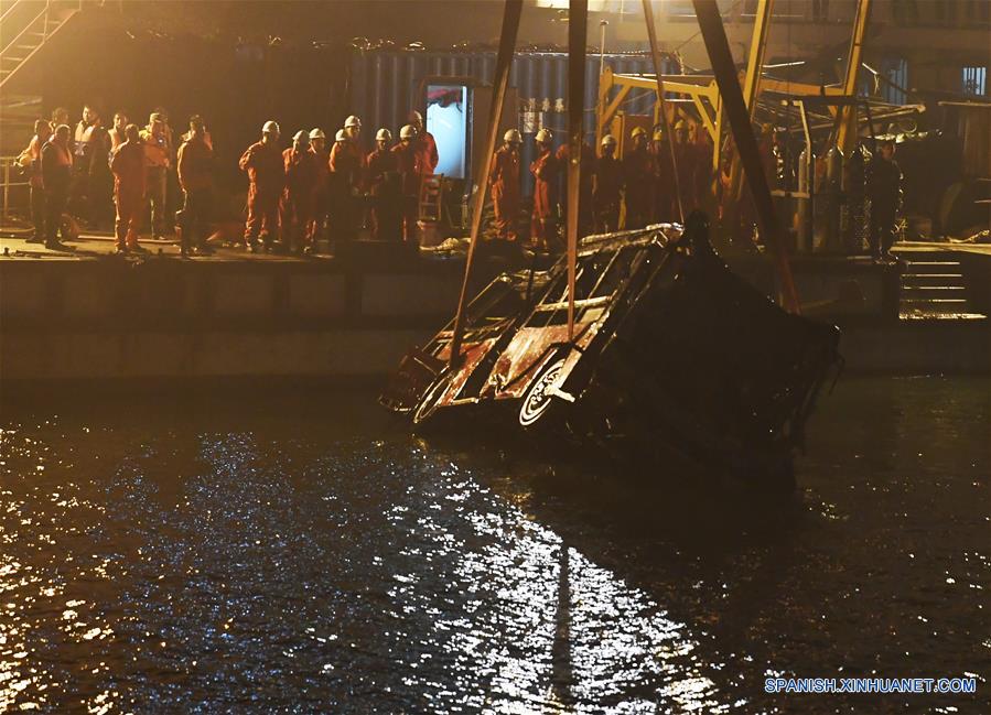 Rescatistas recuperan un autobús que cayó al río Yangtze en Wanzhou, en la municipalidad de Chongqing, en el suroeste de China, el 31 de octubre de 2018. El autobús fue sacado del agua con una grúa flotante alrededor de las 23:30 horas. Se espera que los socorristas entren al autobús en busca de más cuerpos de víctimas. El domingo, el autobús tomó el carril equivocado en la carretera y chocó de frente contra otro vehículo antes de romper la barra de contención lateral y caer desde un puente hacia el río en el distrito Wanzhou de Chongqing. Una investigación preliminar se?aló que 15 personas, incluido el conductor, estaban a bordo del autobús cuando ocurrió el accidente. Hasta el momento, han sido recuperados nueve cuerpos. (Xinhua/Wang Quanchao)