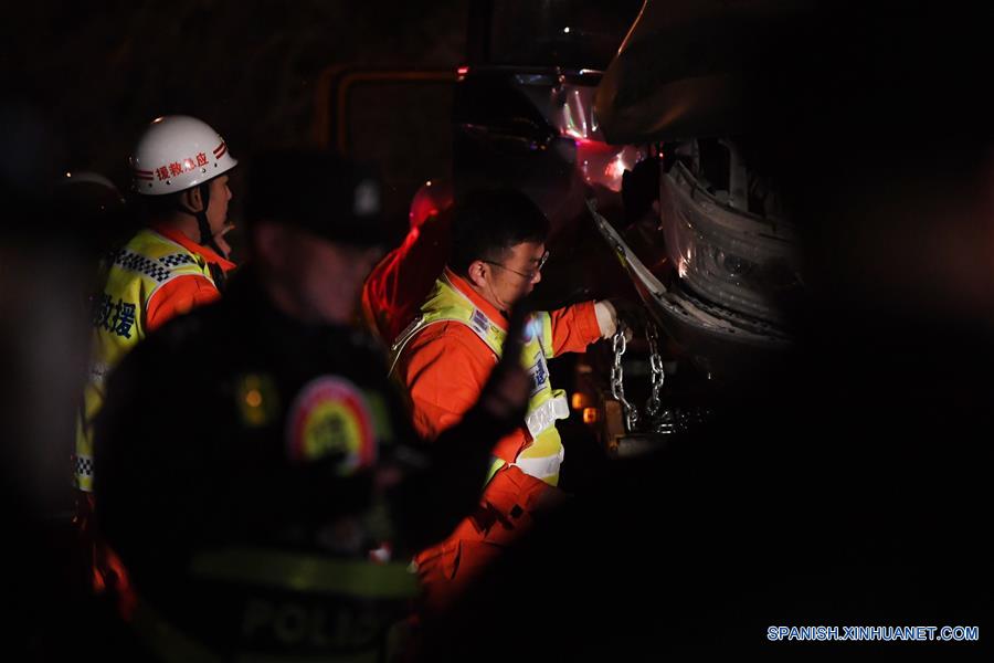 Rescatistas laboran en el sitio de un accidente de tráfico en una estación de peaje en la autopista Lanzhou-Haikou, en Lanzhou, capital de la provincia de Gansu, en el noroeste de China, el 3 de noviembre de 2018. Al menos 14 personas murieron y 27 resultaron heridas como consecuencia de un choque múltiple ocurrido el sábado en una autopista de la provincia norocciental china de Gansu y que involucró a 31 vehículos, informaron las autoridades locales. (Xinhua/Chen Bin)
