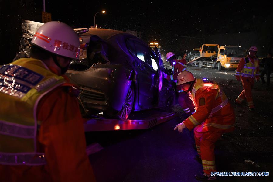 Rescatistas laboran en el sitio de un accidente de tráfico en una estación de peaje en la autopista Lanzhou-Haikou, en Lanzhou, capital de la provincia de Gansu, en el noroeste de China, el 3 de noviembre de 2018. Al menos 14 personas murieron y 27 resultaron heridas como consecuencia de un choque múltiple ocurrido el sábado en una autopista de la provincia norocciental china de Gansu y que involucró a 31 vehículos, informaron las autoridades locales. (Xinhua/Chen Bin)