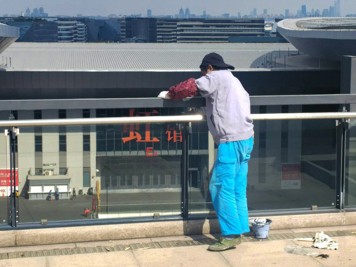 Ni Chunhua y su compa?ero pintan las estructuras para garantizar el acabado estético de los pabellones de la Exposición Internacional de Importaciones de China, a celebrarse del 5 al 10 de noviembre en Shanghai, China. [Foto: Xing Yi/ Chinadaily.com.cn]