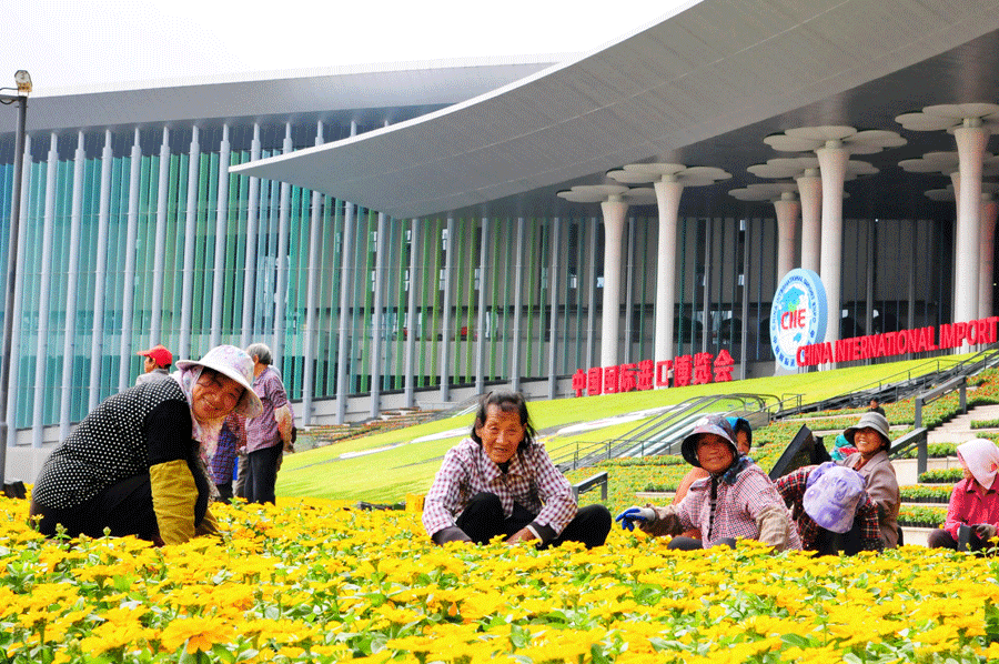 Zhang Mei y sus compa?eros de trabajo colocan las flores para asegurar el acabado estético de los pabellones de la Exposición Internacional de Importaciones de China, a celebrarse del 5 al 10 de noviembre en Shanghai, China. [Foto: Xing Yi/ chinadaily.com.cn]