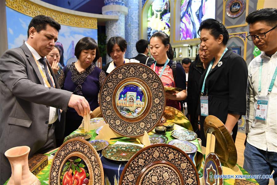 Personas observan las artesanías en el estand de Uzbekistán en la primera Exposición Internacional de Importaciones de China (CIIE) en Shanghai, en el este China, el 6 de noviembre de 2018. Un total de 82 países y tres organizaciones internacionales presentan sus avances en el desarrollo económico y comercial así como productos competitivos en 71 estands en el Pabellón de País para Comercio e Inversión en la CIIE. (Xinhua/Sadat)