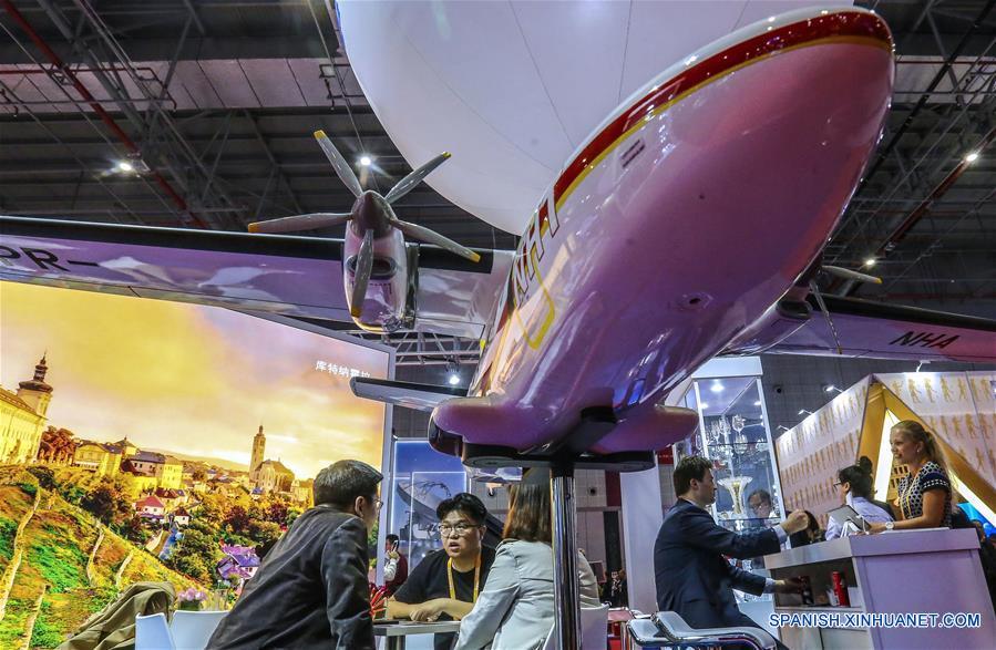 Vista de un modelo de avión de cercanías en el estand de la República Checa en la primera Exposición Internacional de Importaciones de China (CIIE) en Shanghai, en el este China, el 6 de noviembre de 2018. La primera CIIE se lleva a cabo del 5 al 10 de noviembre en Shanghai. (Xinhua/Yin Gang)