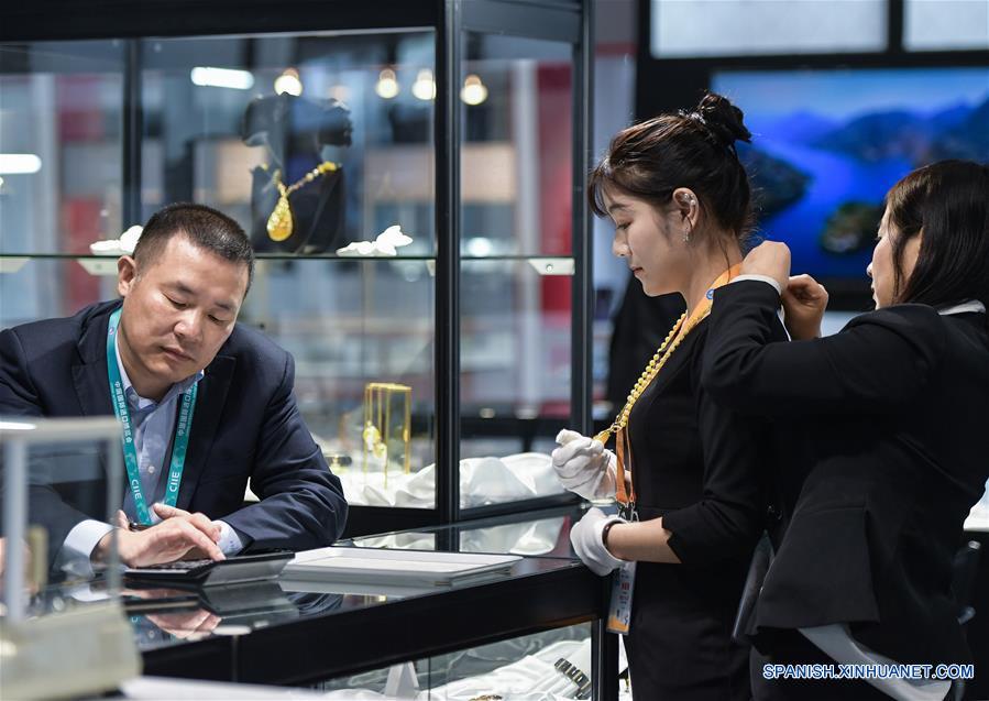 Una empleada se prueba un accesorio de ámbar en la primera Exposición Internacional de Importaciones de China (CIIE) en Shanghai, en el este China, el 6 de noviembre de 2018. La primera CIIE se lleva a cabo del 5 al 10 de noviembre en Shanghai. (Xinhua/Li He)