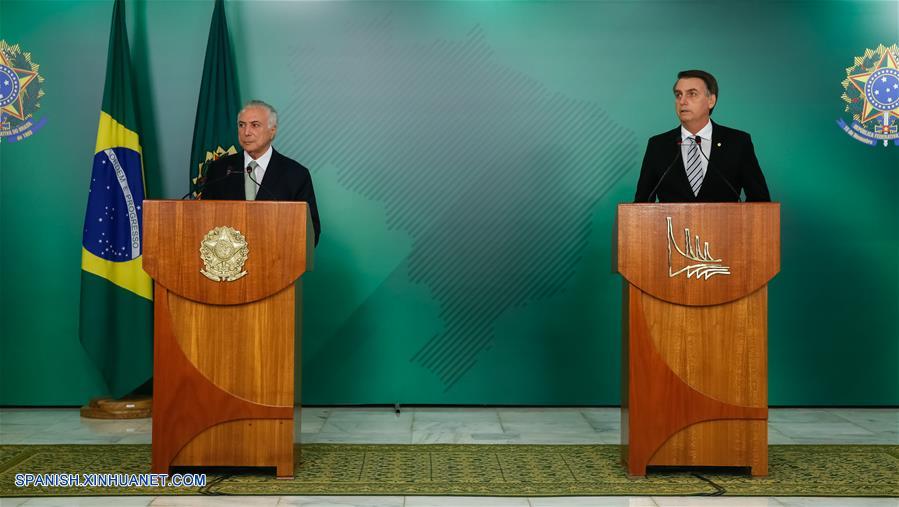 BRASILIA, noviembre 7, 2018 (Xinhua) -- Imagen cedida por la Presidencia de Brasil, del presidente brasile?o, Michel Temer (i), y el presidente electo de Brasil, Jair Bolsonaro (d), participando en una conferencia de prensa conjunta, en Brasilia, Brasil, el 7 de noviembre de 2018. El presidente de Brasil, Michel Temer, y el mandatario electo Jair Bolsonaro formalizaron el miércoles al equipo de transición responsable de la transmisión de informaciones para la nueva administración que asumirá el 1 de enero de 2019. (Xinhua/Rogério Melo/Presidencia de Brasil)