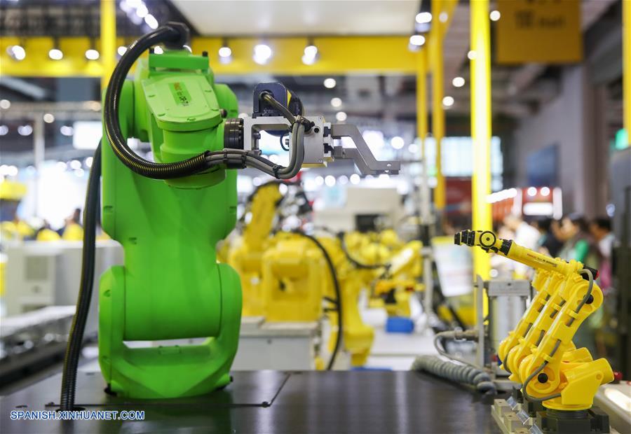 SHANGHAI, noviembre 6, 2018 (Xinhua) -- Robots de Fanuc son mostrados durante la primera Exposición Internacional de Importaciones de China (CIIE), en Shanghai, en el este China, el 6 de noviembre de 2018. El área de exhibición de Equipamiento Inteligente de Alta Gama en la CIIE cubre inteligencia artificial, automatización y robotización industrial, fábricas digitales, energía nueva, equipamiento eléctrico y energético, tecnologías y equipamiento aeroespacial y de aviación, atrayendo a muchos visitantes. (Xinhua/Ding Ting)