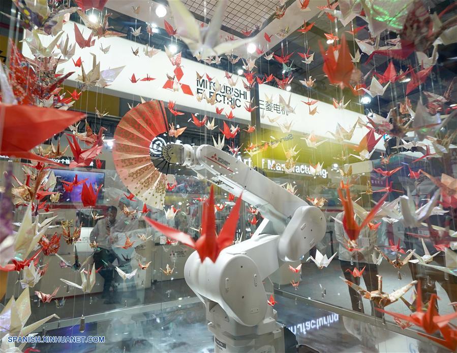 SHANGHAI, noviembre 6, 2018 (Xinhua) -- Un brazo robótico es mostrado en la casilla de Mitsubishi Electric, durante la primera Exposición Internacional de Importaciones de China (CIIE), en Shanghai, en el este China, el 6 de noviembre de 2018. El área de exhibición de Equipamiento Inteligente de Alta Gama en la CIIE cubre inteligencia artificial, automatización y robotización industrial, fábricas digitales, energía nueva, equipamiento eléctrico y energético, tecnologías y equipamiento aeroespacial y de aviación, atrayendo a muchos visitantes. (Xinhua/Ding Ting)
