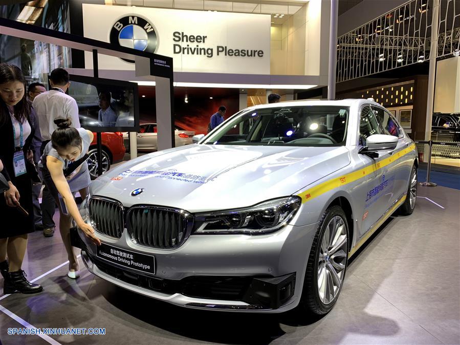 SHANGHAI, noviembre 7, 2018 (Xinhua) -- El automóvil de prueba de conducción autónoma L4 de BMW Serie 7 es exhibido en la primera Exposición Internacional de Importaciones de China (CIIE) en Shanghai, en el este de China, el 7 de noviembre de 2018. (Xinhua/Niu Xiaolei)