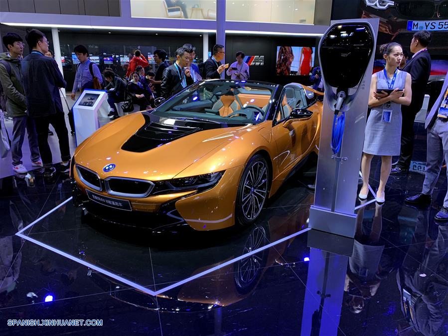 SHANGHAI, noviembre 7, 2018 (Xinhua) -- Visitantes observan el automóvil deportivo hibrido enchufable BMW i8 exhibido en la primera Exposición Internacional de Importaciones de China en Shanghai, en el este de China, el 7 de noviembre de 2018. (Xinhua/Niu Xiaolei)