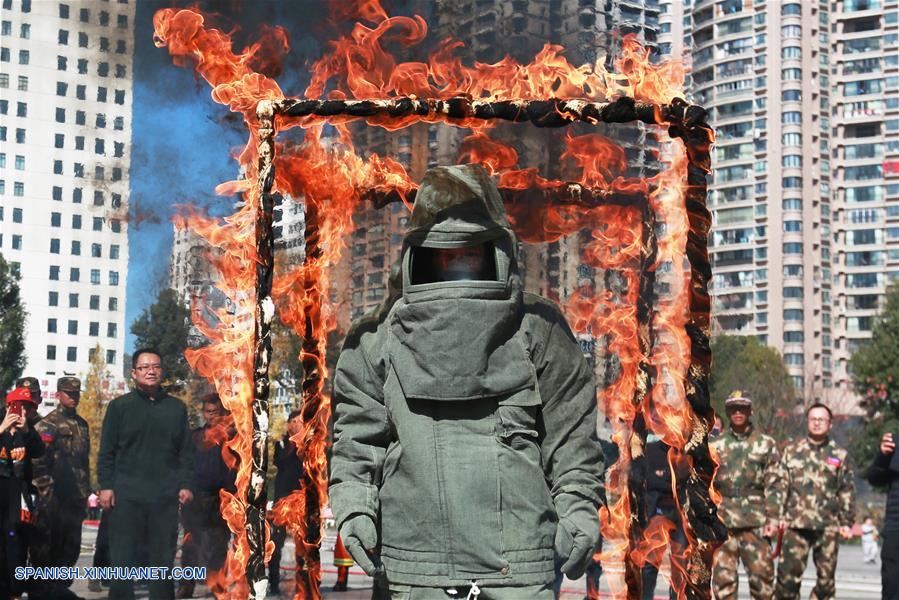 GUIZHOU, noviembre 8, 2018 (Xinhua) -- Un bombero pasa a través de una barrera en llamas durante una campa?a de concienciación sobre seguridad contra incendios, en Bijie, provincia de Guizhou, en el suroeste de China, el 8 de noviembre de 2018. Campa?as de concienciación sobre seguridad contra incendios han sido llevadas a cabo alrededor de China en la jornada previa al Día Nacional de la Prevención de Incendios el 9 de noviembre. (Xinhua/Wang Chunliang)