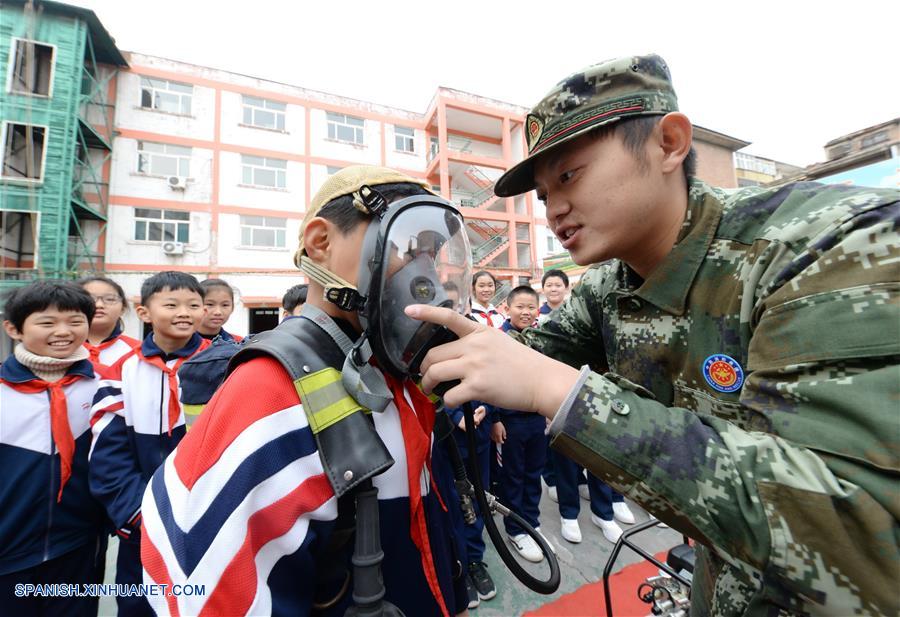 HEBEI, noviembre 8, 2018 (Xinhua) -- Un bombero muestra a un estudiante a usar una máscara de oxígeno, en Handan, provincia de Hebei, en el norte de China, el 8 de noviembre de 2018. Campa?as de concienciación sobre seguridad contra incendios han sido llevadas a cabo alrededor de China en la jornada previa al Día Nacional de la Prevención de Incendios el 9 de noviembre. (Xinhua/Zhu Xudong)