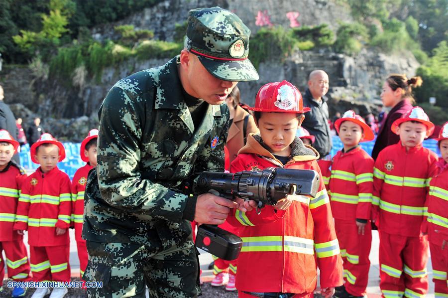 HUBEI, noviembre 8, 2018 (Xinhua) -- Un bombero muestra a un grupo de estudiantes cómo usar equipo contra incendios, en el condado de Zigui, provincia de Hubei, en el centro de China, el 8 de noviembre de 2018. Campa?as de concienciación sobre seguridad contra incendios han sido llevadas a cabo alrededor de China en la jornada previa al Día Nacional de la Prevención de Incendios el 9 de noviembre. (Xinhua/Wang Huifu)