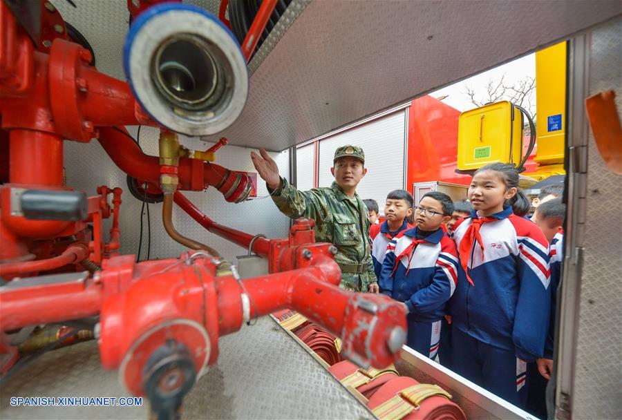HEBEI, noviembre 8, 2018 (Xinhua) -- Un bombero muestra un camión de bomberos a un grupo de estudiantes, en Handan, provincia de Hebei, en el norte de China, el 8 de noviembre de 2018. Campa?as de concienciación sobre seguridad contra incendios han sido llevadas a cabo alrededor de China en la jornada previa al Día Nacional de la Prevención de Incendios el 9 de noviembre. (Xinhua/Zhu Xudong)
