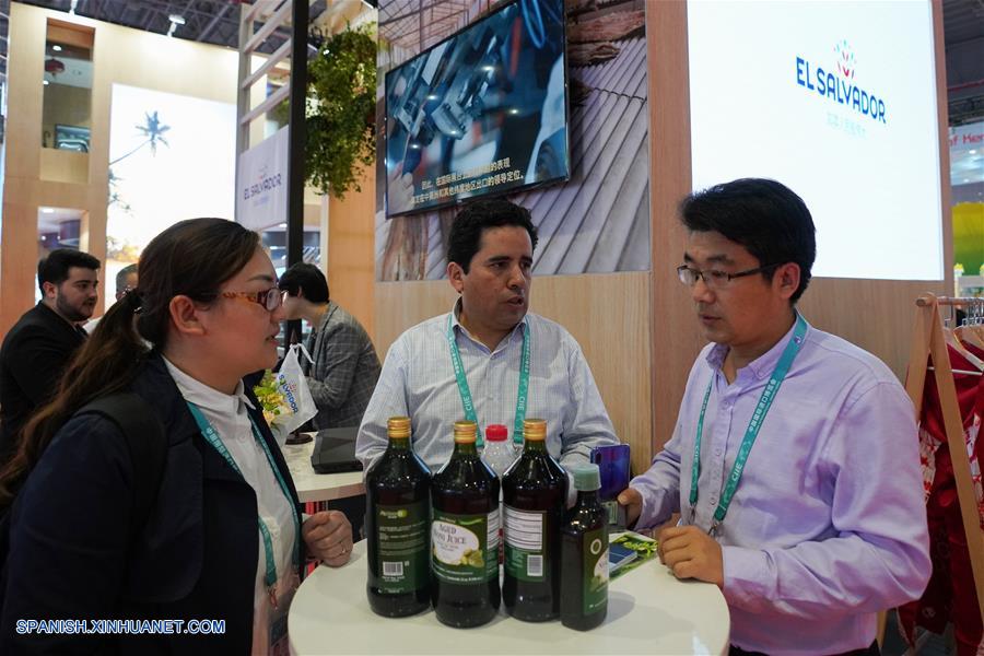 SHANGHAI, noviembre 8, 2018 (Xinhua) -- Imagen del 7 de noviembre de 2018 de una visitante (i) obteniendo información acerca del jugo de frutas en el estand de El Salvador en la primera Exposición Internacional de Importaciones de China (CIIE) en Shanghai, en el este de China. Un total de 82 países y tres organizaciones internacionales mostraron sus logros en el desarrollo económico y comercial así como sus productos competitivos en 71 estands en el Pabellón de País para el Comercio y la Inversión en la CIIE. (Xinhua/Wang Tiancong)