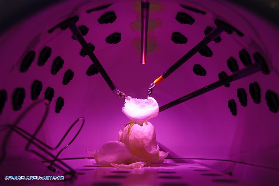 SHANGHAI, noviembre 8, 2018 (Xinhua) -- Pétalos de flor son cortados por el Sistema Quirúrgico da Vinci Xi durante una demostración en el área de Productos de Equipo Médico y Cuidado de la Salud de la primera Exposición Internacional de Importaciones de China (CIIE) en Shanghai, en el este de China, el 8 de noviembre de 2018. (Xinhua/Liu Dawei)
