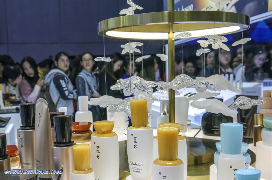 SHANGHAI, noviembre 9, 2018 (Xinhua) -- Visitantes forman una fila para observar productos de Sulwhasoo en el área de Ropa, Accesorios y Bienes de Consumo de la primera Exposición Internacional de Importaciones de China (CIIE), en Shanghai, en el este de China, el 9 de noviembre de 2018. (Xinhua/Yin Gang)