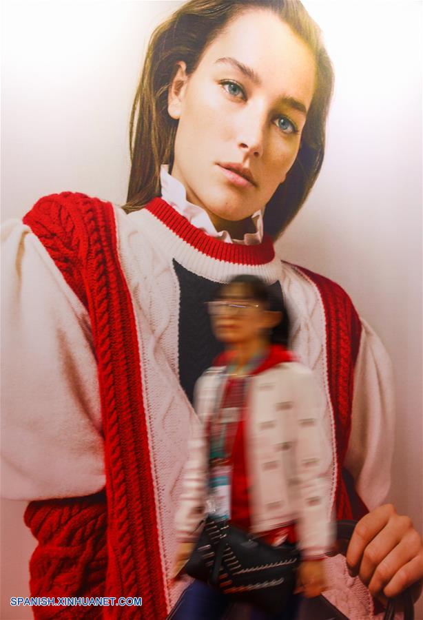 SHANGHAI, noviembre 9, 2018 (Xinhua) -- Imagen del 8 de noviembre de 2018 de una expositora caminando frente a un cartel de una emprasa de ropa francesa en el área de Ropa, Accesorios y Bienes de Consumo de la primera Exposición Internacional de Importaciones de China (CIIE), en Shanghai, en el este de China. (Xinhua/Liu Dawei)