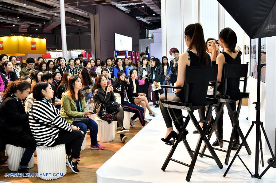 SHANGHAI, noviembre 9, 2018 (Xinhua) -- Imagen del 8 de noviembre de 2018 de visitantes aprendiendo las habilidades del maquillaje en el área de Ropa, Accesorios y Bienes de Consumo de la primera Exposición Internacional de Importaciones de China (CIIE), en Shanghai, en el este de China. (Xinhua/Lin Xin)