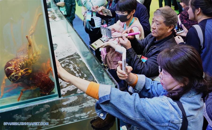 SHANGHAI, noviembre 9, 2018 (Xinhua) -- Una visitante mide el tama?o de las langostas con su mano en la primera Exposición Internacional de Importaciones de China (CIIE), en Shanghai, en el este de China, el 9 de noviembre de 2018. La CIIE es abierta a los grupos de visitantes del 9 al 10 de noviembre. (Xinhua/Bi Xiaoyang)
