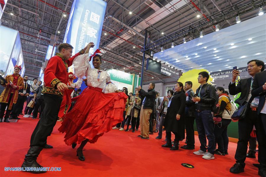 SHANGHAI, noviembre 9, 2018 (Xinhua) -- Imagen del 8 de noviembre de 2018 de una bailarina dominicana y un bailarín ruso realizando una actuación en la primera Exposición Internacional de Importaciones de China (CIIE), en Shanghai, en el este de China. La CIIE fue inaugurada el lunes en Shanghai, atrayendo a participantes de 172 países, regiones y organizaciones internacionales. (Xinhua/Zhang Yuwei)
