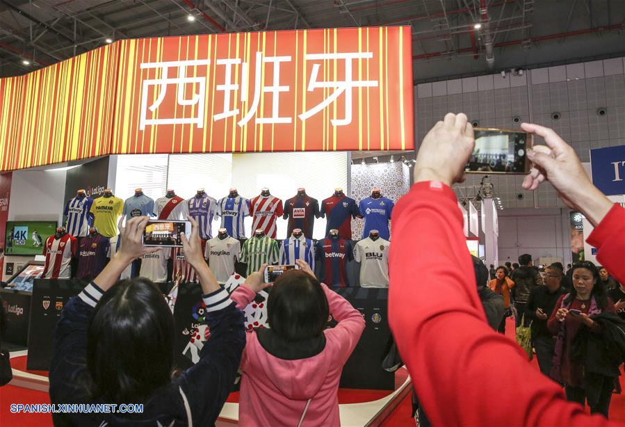 SHANGHAI, noviembre 9, 2018 (Xinhua) -- Personas toman fotografías de los uniformes de los equipos de La Liga espa?ola en la primera Exposición Internacional de Importaciones de China (CIIE), en Shanghai, en el este de China, el 9 de noviembre de 2018. La CIIE fue inaugurada el lunes en Shanghai, atrayendo a participantes de 172 países, regiones y organizaciones internacionales. (Xinhua/Yin Gang)
