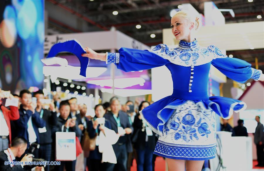 SHANGHAI, noviembre 9, 2018 (Xinhua) -- Imagen del 8 de noviembre de 2018 de una artista interpretando un baile en el estand de Rusia en la primera Exposición Internacional de Importaciones de China (CIIE), en Shanghai, en el este de China. La CIIE fue inaugurada el lunes en Shanghai, atrayendo a participantes de 172 países, regiones y organizaciones internacionales. (Xinhua/Han Yuqing)