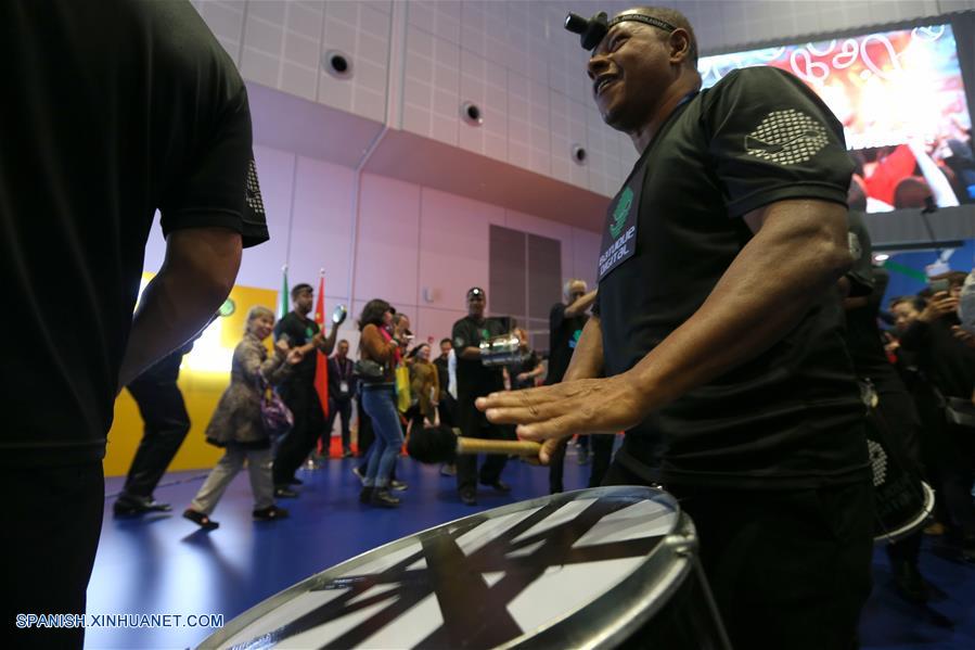 SHANGHAI, noviembre 9, 2018 (Xinhua) -- Personas actúan en el estand de Brasil en la primera Exposición Internacional de Importaciones de China (CIIE), en Shanghai, en el este de China, el 9 de noviembre de 2018. La CIIE fue inaugurada el lunes en Shanghai, atrayendo a participantes de 172 países, regiones y organizaciones internacionales. (Xinhua/Zhang Jiayang)