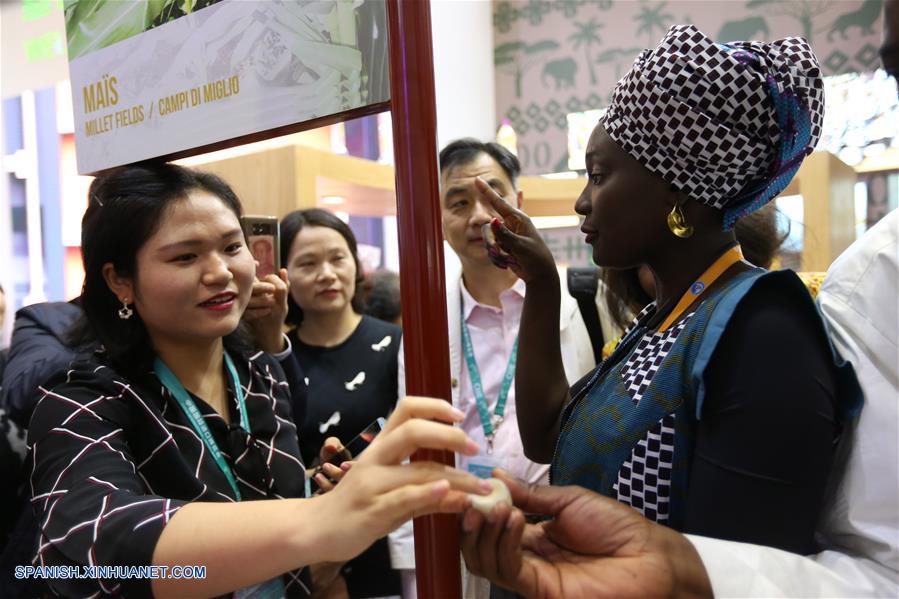 SHANGHAI, noviembre 9, 2018 (Xinhua) -- Una visitante prueba productos del cuidado de la piel en el estand de Senegal en la primera Exposición Internacional de Importaciones de China (CIIE), en Shanghai, en el este de China, el 9 de noviembre de 2018. La CIIE fue inaugurada el lunes en Shanghai, atrayendo a participantes de 172 países, regiones y organizaciones internacionales. (Xinhua/Zhang Jiayang)