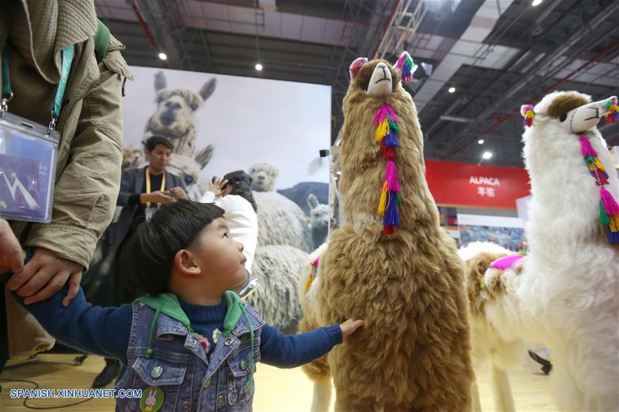 SHANGHAI, noviembre 9, 2018 (Xinhua) -- Un ni?o observa modelos de alpaca en el estand de Perú en la primera Exposición Internacional de Importaciones de China (CIIE), en Shanghai, en el este de China, el 9 de noviembre de 2018. La CIIE fue inaugurada el lunes en Shanghai, atrayendo a participantes de 172 países, regiones y organizaciones internacionales. (Xinhua/Zhang Jiayang)